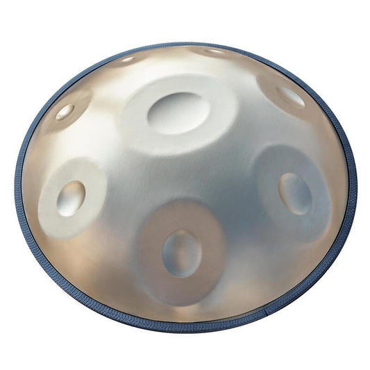 HluruShop Handpan drum is a musical instrument in the idiophone class. It is constructed from two half-shells of deep drawn, with hollow inside and in the shape of a convex lens. The top ("Ding") side has a center 'note' hammered into it and 'tone fields' hammered around the center. The bottom ("Gu") is a plain surface that has a rolled hole in the center with a tuned note that can be created when the rim is struck.