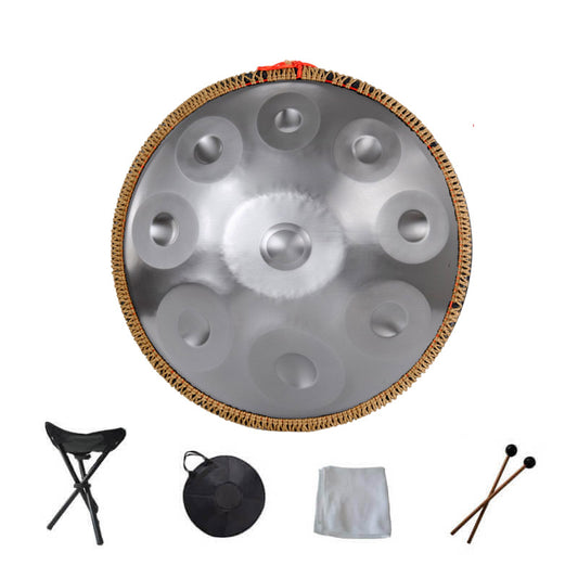HluruShop Hand pan drum is a musical instrument in the idiophone class. It is constructed from two half-shells of deep drawn, with hollow inside and in the shape of a convex lens. The top ("Ding") side has a center 'note' hammered into it and 'tone fields' hammered around the center. The bottom ("Gu") is a plain surface that has a rolled hole in the center with a tuned note that can be created when the rim is struck.